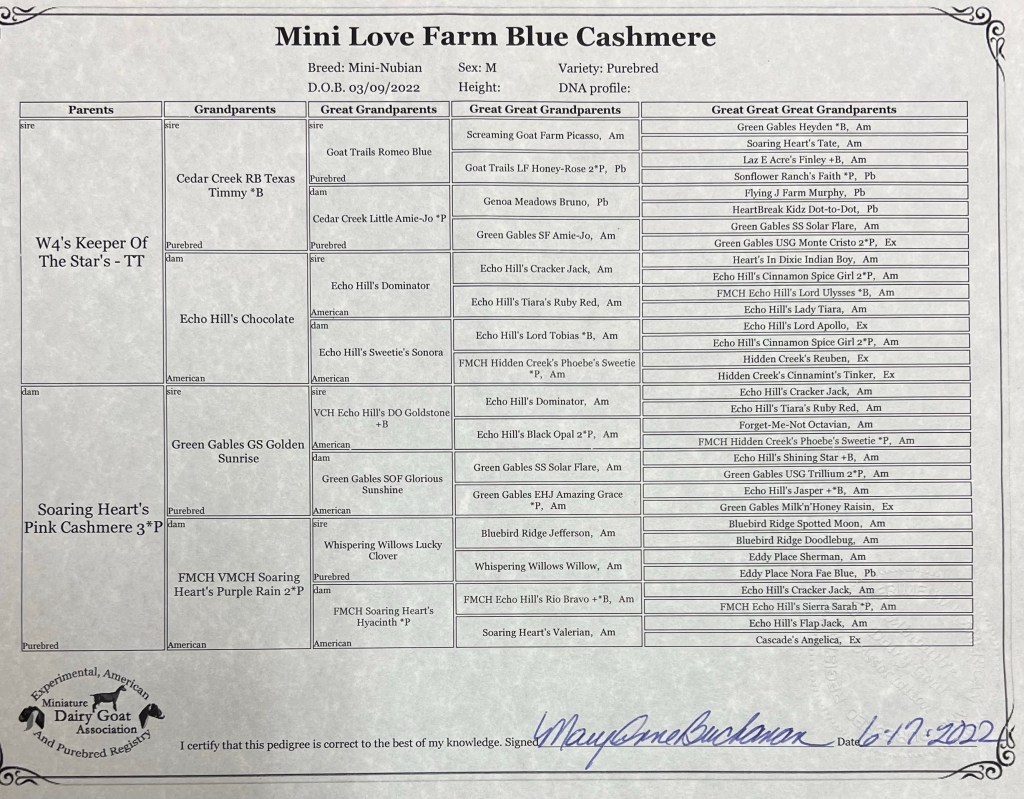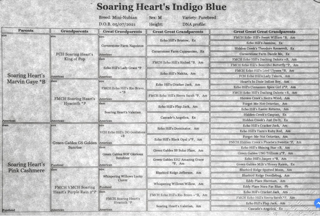 Blue Cashmere has the same Dam as my new boy, but different Sires. Cashmere’s Sire’s Dam; Echo Hills Chocolate was shown successfully but was never milk tested. Echo Hills is a long time producer of excellent Mini Nubian Goats, one of the Pioneer breeders of the breed that we love today. Many of Echo Hills Goats, grace the extended pedigrees of many, top performing Goats, in both Milk Production and Show Champions (Conformation).