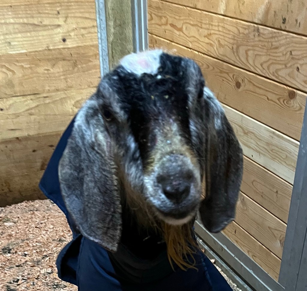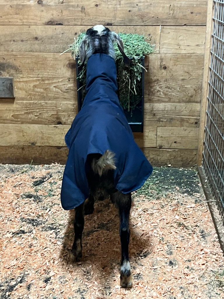 12/14 – Welcome Home Soaring Heart’s Indigo Blue*B! I brought him home today, gave his head and legs a nice warm bath. Applied my daughters Super Healing Salve she makes, to his urine scalds on his front legs and nose. Put a coat on him and tucked him into a stall for the night. He is the sweetest, gentle Buck! So happy I brought him home. I’ll put a buck apron on him tomorrow to help with the urine scalding.