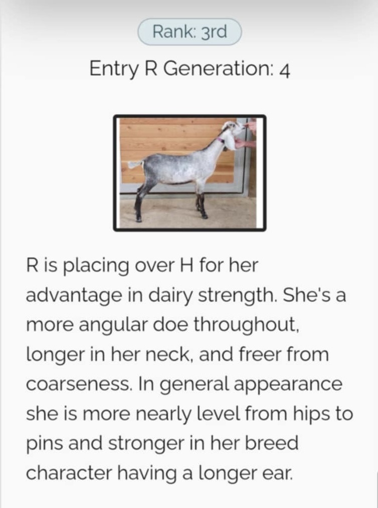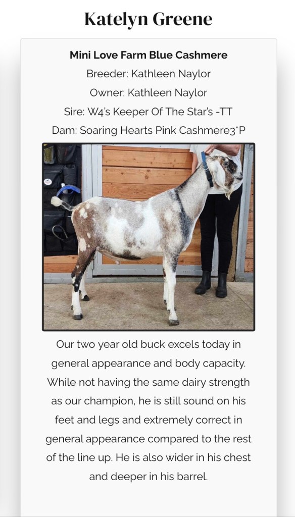 As I said above about how Katelyn Greene Judges the Mini Nubians, read her remarks above. “Dairy Strength, Breed Character, Angular, nearly level from hips to pins and Freer from courseness”