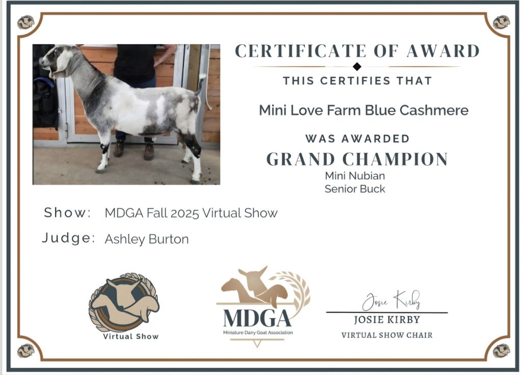 Blue Cashmere won his first and second Championship in the 2025 MDGA Fall Virtual Show in Mini Nubian Senior Bucks category.
