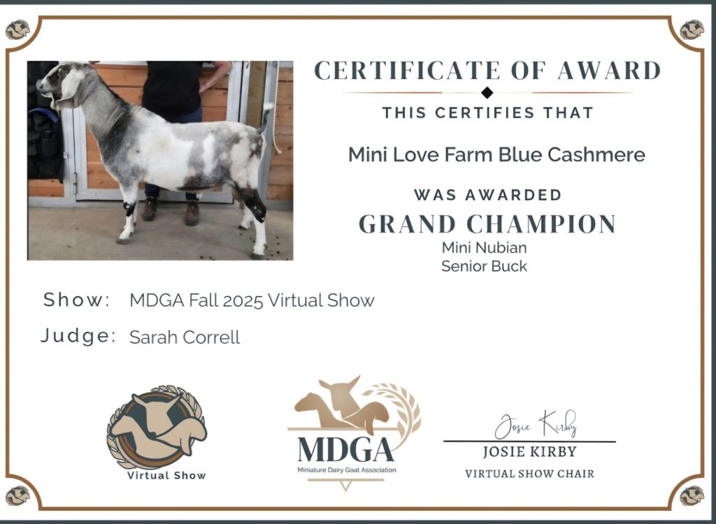 MDGA FALL 2025 VIRTUAL SHOW GRAND CHAMPION MINI NUBIAN SENIOR BUCK. UNDER BOTH JUDGES.