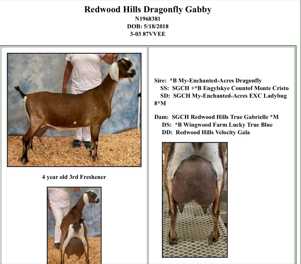 June 2024: Gabriella is maturing into a lovely Doe with a beautiful FF Udder! Gabriella is one of my favorite Does!
