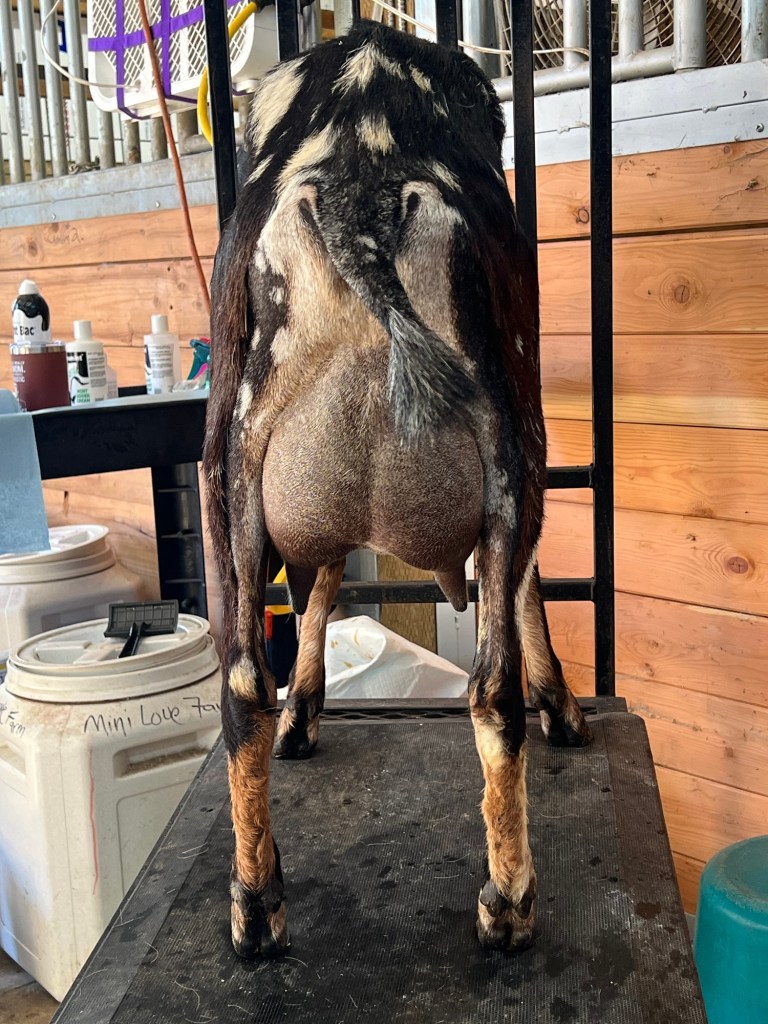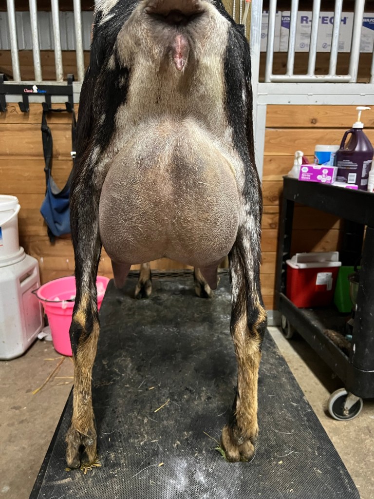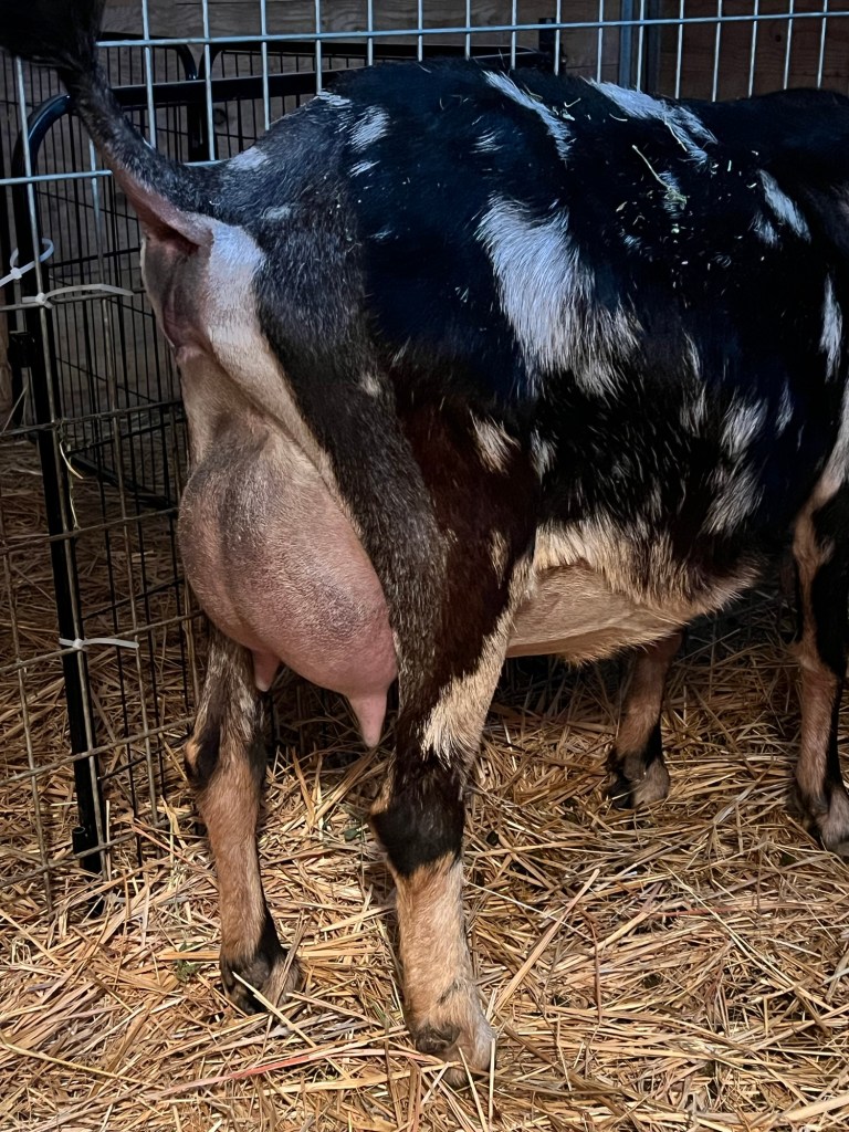 I have been wanting this young Doe ever since I first saw her! I Love her Sire and Dam, both are finished Champions and the Udders behind this beautiful Doe are amazing on both sides!